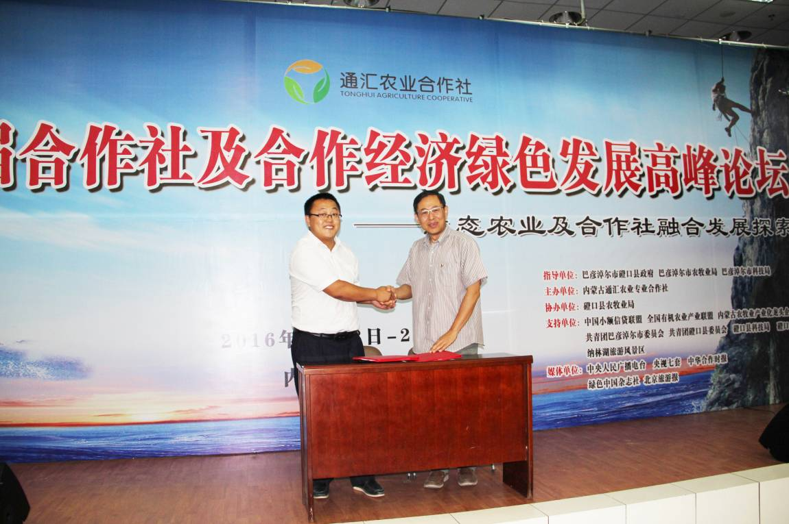 在論壇最后,分別由內蒙古巴彥淖爾市磴口縣農牧業(yè)局局長長路和全國有機產業(yè)聯(lián)盟副秘書長劉霽雲(yún)共同為“內蒙古磴口縣科技扶貧示范基地”揭牌,簽訂“科技扶貧示范基地合作協(xié)議”;中國小額信貸聯(lián)盟秘書長白澄宇和內蒙古通匯農業(yè)合作社理事長王祿先生簽署“儲蓄互助業(yè)務試點”項目協(xié)議;中國人民大學農村與農業(yè)經(jīng)濟發(fā)展學院副院長孔祥智和內蒙古磴口縣農牧業(yè)局局長張長路,共同為“中國合作社學院教學實踐基地”揭牌等項議程。