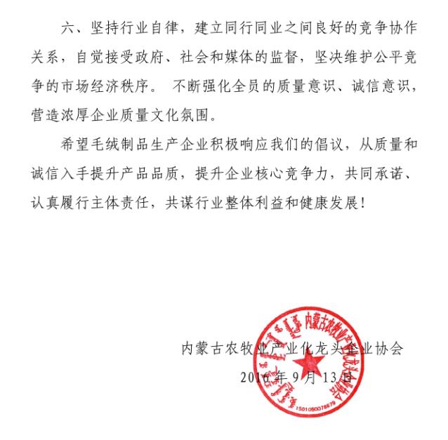 會(huì)上,質(zhì)監(jiān)局質(zhì)量監(jiān)督處副處長艾繼青宣讀國務(wù)院辦公廳《關(guān)于開展消費(fèi)品工業(yè)“三品”專項(xiàng)行動(dòng)營造良好市場(chǎng)環(huán)境的若干意見》;孫磐處長向與會(huì)人員通報(bào)了近年羊絨監(jiān)督抽查的質(zhì)量狀況基本情況,并傳達(dá)了內(nèi)蒙古質(zhì)監(jiān)局印發(fā)的毛絨制品行業(yè)質(zhì)量提升推進(jìn)“三品三同”專項(xiàng)行動(dòng)方案;纖維檢驗(yàn)局總工程師曹渭芳介紹了纖檢局助力企業(yè)產(chǎn)品質(zhì)量提升檢驗(yàn)?zāi)芰Φ姆?wù)舉措;協(xié)會(huì)副會(huì)長、羊絨分會(huì)名譽(yù)會(huì)長單位鄂爾多斯羊絨集團(tuán),協(xié)會(huì)副會(huì)長、內(nèi)蒙古鹿王羊絨制品有限公司及內(nèi)蒙古豐蒂妮羊絨制品有限公司三家企業(yè)相關(guān)負(fù)責(zé)人介紹了各自企業(yè)在落實(shí)國家和自治區(qū)羊絨產(chǎn)業(yè)政策、加快企業(yè)轉(zhuǎn)型升級(jí)和產(chǎn)品質(zhì)量提升方面的先進(jìn)經(jīng)驗(yàn);內(nèi)蒙古農(nóng)牧業(yè)產(chǎn)業(yè)化龍頭企業(yè)協(xié)會(huì)常務(wù)秘書長劉俊青代表行業(yè)協(xié)會(huì)向全區(qū)毛絨制品相關(guān)企業(yè)發(fā)起全區(qū)毛絨制品行業(yè)誠信倡議書,呼吁毛絨制品企業(yè)從質(zhì)量和誠信入手,提升產(chǎn)品品質(zhì),提升企業(yè)核心競(jìng)爭(zhēng)力,認(rèn)真履行責(zé)任,共同推進(jìn)行業(yè)整體利益和健康發(fā)展。