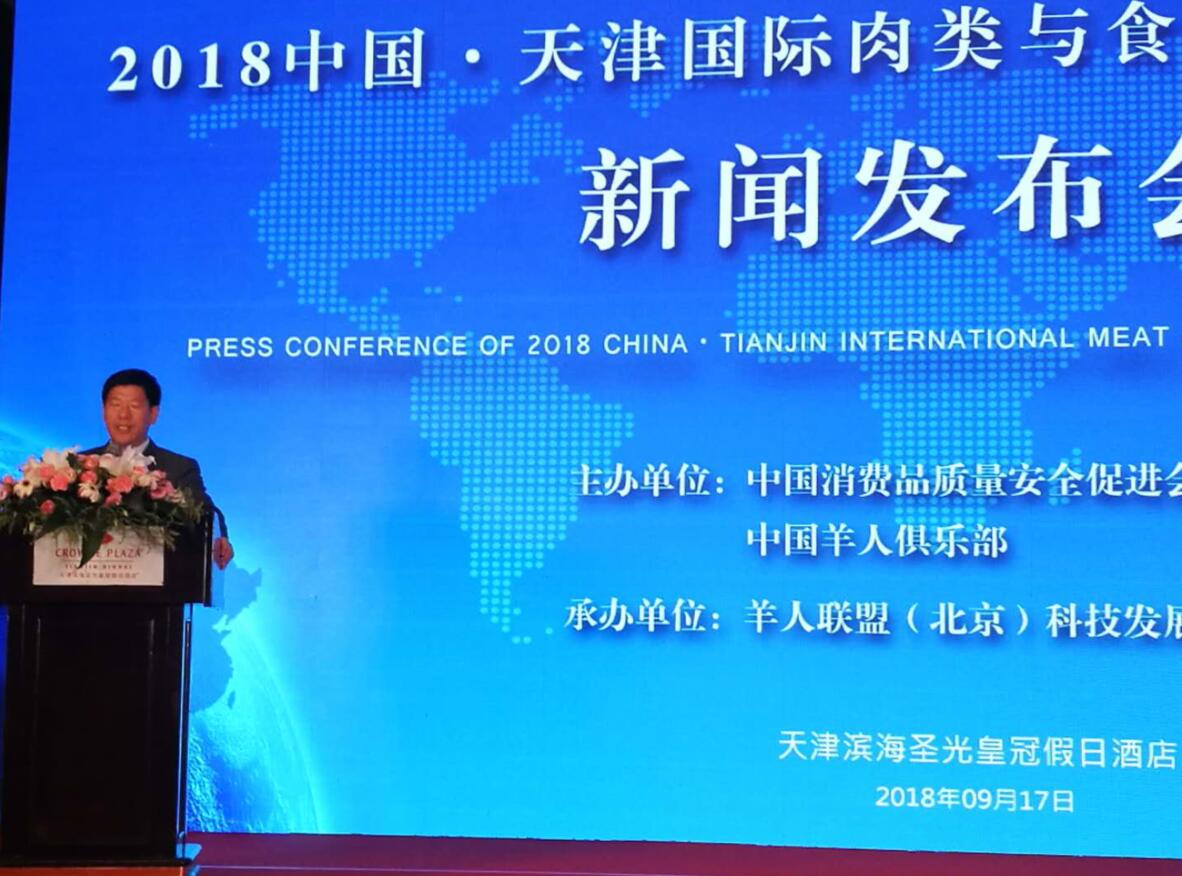 2018年9月17日,“2018天津國際肉類與食品進(jìn)出口博覽會(huì)”新聞發(fā)布會(huì)在天津?yàn)I海圣光皇冠假日酒店召開。中國消費(fèi)品質(zhì)量安全促進(jìn)會(huì)秘書長曾召朋,天津市商務(wù)委員會(huì)副主任劉東水,內(nèi)蒙古農(nóng)牧業(yè)產(chǎn)業(yè)化龍頭企業(yè)協(xié)會(huì)執(zhí)行會(huì)長林永亮,副會(huì)長、內(nèi)蒙古大盛業(yè)羊絨制品有限公司總經(jīng)理魯耀武等相關(guān)負(fù)責(zé)人出席會(huì)議并致辭。