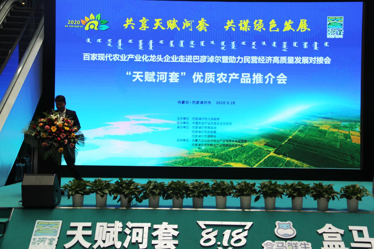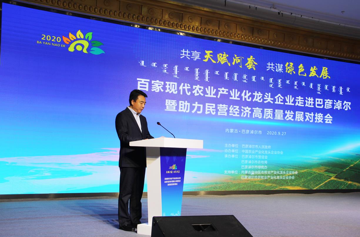 9月27日,由巴彥淖爾市人民政府主辦,中國農(nóng)業(yè)產(chǎn)業(yè)化龍頭企業(yè)協(xié)會協(xié)辦,巴彥淖爾市貿(mào)促會、巴彥淖爾市農(nóng)牧局、巴彥淖爾市綠統(tǒng)辦承辦,內(nèi)蒙古農(nóng)牧業(yè)產(chǎn)業(yè)化龍頭企業(yè)協(xié)會、巴彥淖爾市農(nóng)牧業(yè)產(chǎn)業(yè)化龍頭企業(yè)協(xié)會支持,以“共享‘天賦河套’·共謀綠色發(fā)展”為主題的百家現(xiàn)代農(nóng)業(yè)產(chǎn)業(yè)化龍頭企業(yè)走進巴彥淖爾暨助力民營經(jīng)濟高質(zhì)量發(fā)展對接會在巴彥淖爾市臨河區(qū)召開。中國農(nóng)業(yè)產(chǎn)業(yè)化龍頭企業(yè)協(xié)會會長劉身利,中國農(nóng)科院紀檢組組長史志國,內(nèi)蒙古自治區(qū)黨委巡視二組駐巴彥淖爾市優(yōu)化營商環(huán)境專項工作組副組長董躍飛,巴彥淖爾市委副書記、市長張曉兵,市人大常委會主任閆鵬,市委副書記、政法委書記李中增,市委常委孫艾芳、王志平出席會議,副市長任逸群作市情推介,內(nèi)蒙古農(nóng)牧業(yè)產(chǎn)業(yè)化龍頭企業(yè)協(xié)會會長周勇應邀出席會議。