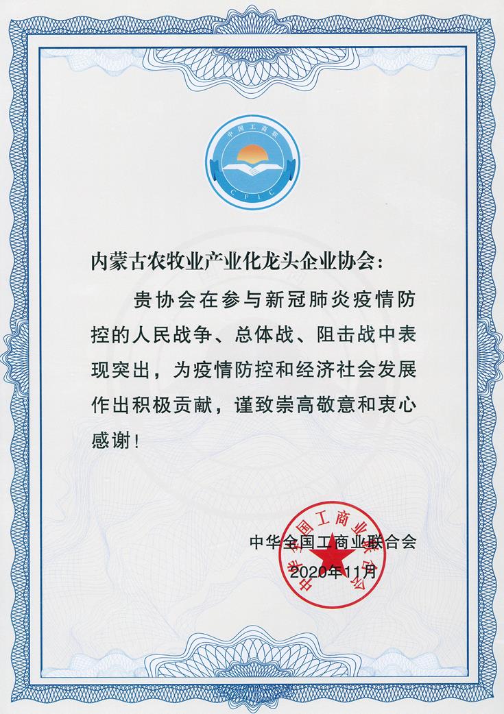 在抗擊新冠肺炎疫情過程中,內(nèi)蒙古農(nóng)牧業(yè)產(chǎn)業(yè)化龍頭企業(yè)協(xié)會(huì)把疫情防控作為重大政治任務(wù),堅(jiān)決貫徹落實(shí)習(xí)近平總書記重要指示精神和黨中央、自治區(qū)決策部署,立足自身優(yōu)勢(shì),主動(dòng)擔(dān)當(dāng)作為,統(tǒng)籌做好疫情防控和復(fù)工復(fù)產(chǎn),為統(tǒng)籌推進(jìn)疫情防控和經(jīng)濟(jì)社會(huì)發(fā)展取得階段性勝利做出了重要貢獻(xiàn)。