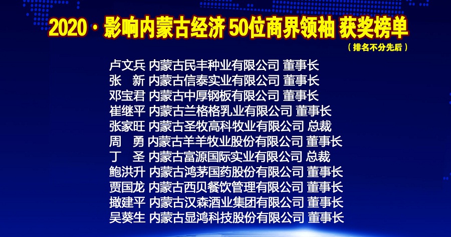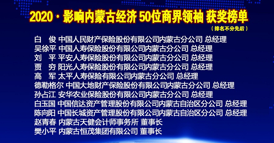 年會上內蒙古金融網、內蒙古新金融研究院隆重推出2020•影響內蒙古經濟50位商界領袖榜單,從2015年度開始,每年按照項目發(fā)展,甄選出當年度引領商界風潮的50位內蒙古最具影響力的商界領袖。