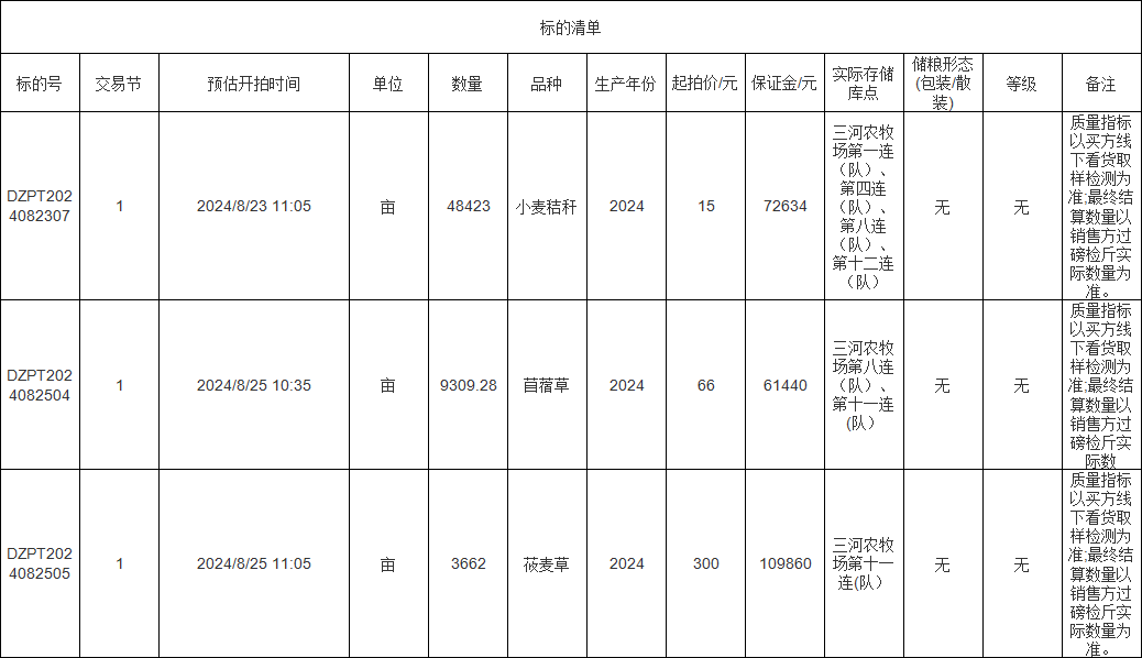 轉(zhuǎn)讓標(biāo)的為苜蓿草、莜麥草、小麥秸稈,涉及面積苜蓿草9309.28畝、莜麥草3662畝、小麥秸稈48423畝,意向受讓方在競標(biāo)前應(yīng)自行對標(biāo)的預(yù)估數(shù)量和質(zhì)量情況進(jìn)行充分了解,交易標(biāo)的均以實(shí)際狀況為準(zhǔn)。標(biāo)的存放地位于三河農(nóng)牧場,詳情見標(biāo)的清單: