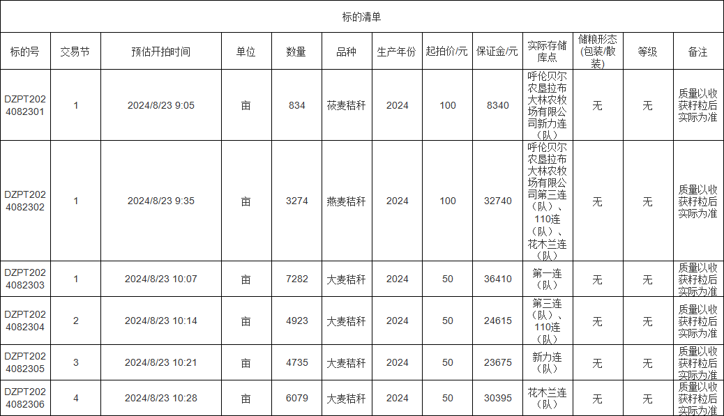 轉(zhuǎn)讓標(biāo)的為莜麥秸稈、燕麥秸稈、大麥秸稈,涉及面積莜麥秸稈834畝、燕麥秸稈3274畝、大麥秸稈(1-4標(biāo))分別為7282畝、4923畝、4735畝、6079畝,意向受讓方在競買前應(yīng)自行對(duì)標(biāo)的預(yù)估數(shù)量和質(zhì)量情況進(jìn)行充分了解,交易標(biāo)的均以實(shí)際狀況為準(zhǔn)。標(biāo)的存放地位于呼倫貝爾農(nóng)墾拉布大林農(nóng)牧場有限公司,詳情見標(biāo)的清單: