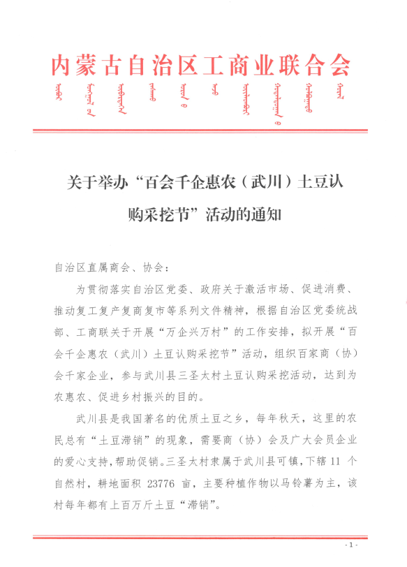 關于舉辦“百會千企惠農(nóng)(武川)土豆認購采挖節(jié)”活動的通知