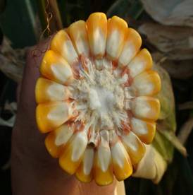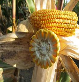 春播區(qū)從出苗至成熟126天左右。株型緊湊,株高271-286cm,穗位96cm。穗行數(shù)16-18 行,紅軸,果穗整齊、均勻;出籽率高達90%,軸細、粒深;長勢整齊一致,不空桿,產(chǎn) 量年度間差異小,穩(wěn)產(chǎn)性好。
