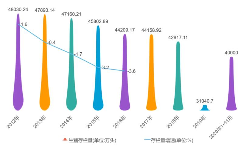 2020年,隨著全國規(guī)模豬場、散養(yǎng)戶的增加,新增產(chǎn)能陸續(xù)釋放,截至11月末,全國能繁母豬存欄已連續(xù)14個(gè)月增長,生豬存欄已連續(xù)10個(gè)月增長。11月末全國能繁母豬存欄超過4100萬頭、生豬存欄超過4億頭,生豬產(chǎn)能已恢復(fù)到2017年底的90%以上。11月,規(guī)模豬場新生仔豬超過3100萬頭,比年初增長94.1%。