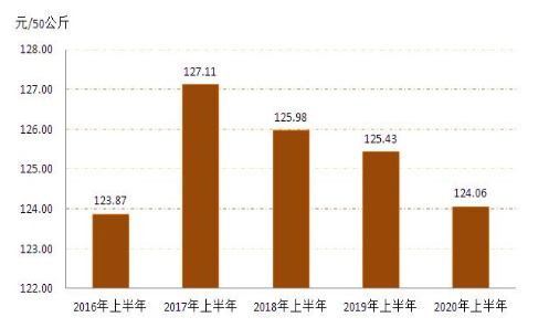 1.小麥:1、2月份春節(jié)假期疊加新冠肺炎疫情,糧企停工停產(chǎn),市場交易趨于平淡,小麥?zhǔn)召弮r(jià)格整體穩(wěn)定。3月份之后,隨著新冠肺炎疫情得到有效控制,各地復(fù)工復(fù)產(chǎn)復(fù)學(xué)的大范圍推進(jìn),截止12月份全區(qū)小麥每50公斤平均收購價(jià)格為124.06元,同比下降1.09%,詳見圖3(來源:內(nèi)蒙古自治區(qū)發(fā)展和改革委員會)
