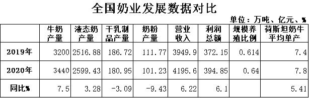 新冠肺炎疫情后,乳業(yè)成為逆勢增長的行業(yè)之一,乳企業(yè)績不斷好轉,整個行業(yè)的利潤總額同比降幅不斷收窄,10月利潤總額增幅由負轉正,今年以來首次轉為正值。隨著消費者對健康飲食更加重視,乳業(yè)的未來發(fā)展會更好。根據(jù)國家統(tǒng)計局數(shù)據(jù),2020年全國液態(tài)奶產量2599.43萬噸,同比增長3.28%;全國干乳制品產量180.95萬噸,同比下降3.09%;全國奶粉產量101.23萬噸,同比下降9.43%,其中12月份產量10.15萬噸,同比下降1.41%。規(guī)模以上乳企主營業(yè)務收入4195.58億元,同比增長6.22%;利潤總額394.85億元,同比增長6.10%,利潤總額增幅轉正,銷售利潤率9.41%。奶業(yè)轉型升級加快推進。全國奶牛規(guī)模養(yǎng)殖比例達到64%,同比提高2.6個百分點。全國荷斯坦奶牛平均單產超過7.8噸,同比增長400千克。