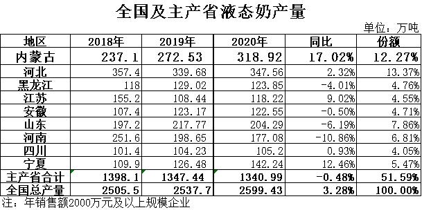 液態(tài)奶:根據(jù)國家統(tǒng)計局數(shù)據(jù),2020年全國液態(tài)奶產量2599.43萬噸,同比增長3.28%,其中12月產量234.28萬噸,同比下降2.30%。其中,河北產量347.56萬噸,同比增長2.32%,占全國總產量的13.37%,位居全國第一位;內蒙古產量318.92萬噸,同比增長17.02%,占全國總產量的12.27%,位居全國第二位。