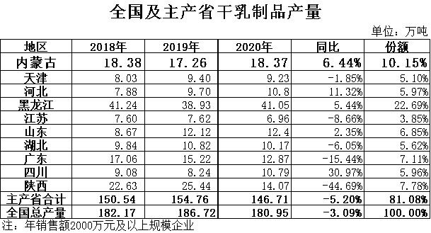 奶粉:根據(jù)國家統(tǒng)計局數(shù)據(jù),2020年全國奶粉產量101.23萬噸,同比下降9.43%,其中黑龍江產量40.01萬噸,同比增長3.02%,占總產量的39.52%,位居全國第一位;內蒙古產量9.58萬噸,同比增長14.90%,占總產量的9.46%,位居全國第四位。