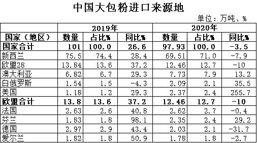 據(jù)中國海關統(tǒng)計,2020年進口大包粉97.93萬噸,同比-3.5%,進口額32.91億美元,同比+5.4%,均價3361美元/噸,同比+9.2%,主要來自新西蘭占71%、歐盟占12.7%、澳大利亞占7.9%。